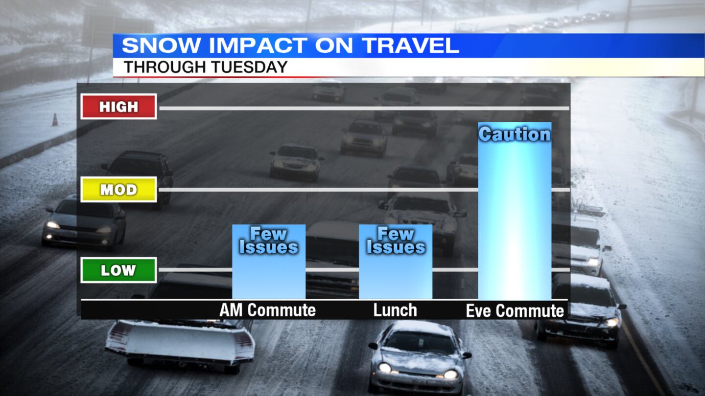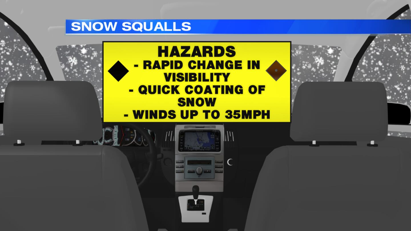 Tuesday: Scattered snow showers will be around along with snow squalls. A snow squall is a short-duration of heavy snow that may bring near white-out conditions. However, overall snow accumulation will be very light. Snow squalls can create dangerous travel conditions due to rapidly changing visibility. The snow squalls are expected during or shortly after the morning commute and likely may linger and even increase for the evening commute. Temperatures will hold in the middle to upper 30s.