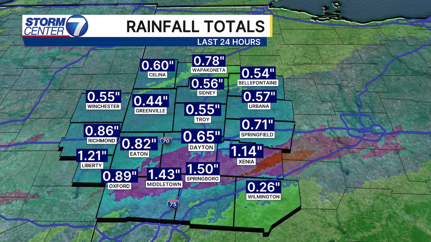 There were some locally higher totals east of Xenia that prompted some road closures due to flowing water across roadways. The highest I found was a manual gauge showing 2.72 inches of rain about six miles east of Xenia.