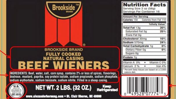 - 2-lbs. vacuum-sealed packages labeled “BROOKSIDE BRAND FULLY COOKED NATURAL CASING BEEF WIENERS” with the lot code 3121, case code 07658, and sell by date of 8/1/23.