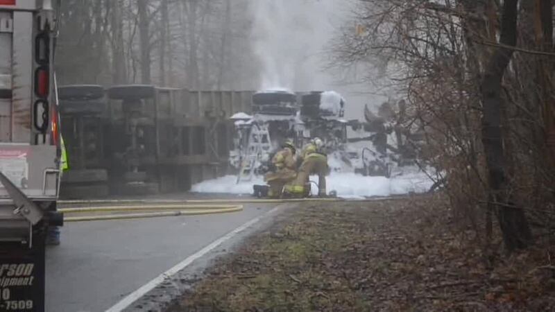 Reports indicate a semi is on its side and caught fire after the crash. Crews reported heavy black smoke as they approached the scene, according to emergency scanner traffic.
