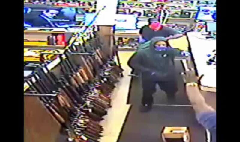 Video surveillance shows the suspects enter the store with guns drawn and multiple bags. They were wearing hoodies and jackets with the hoods up and had their faces covered before they fled in a gold four-door Chevrolet sedan.