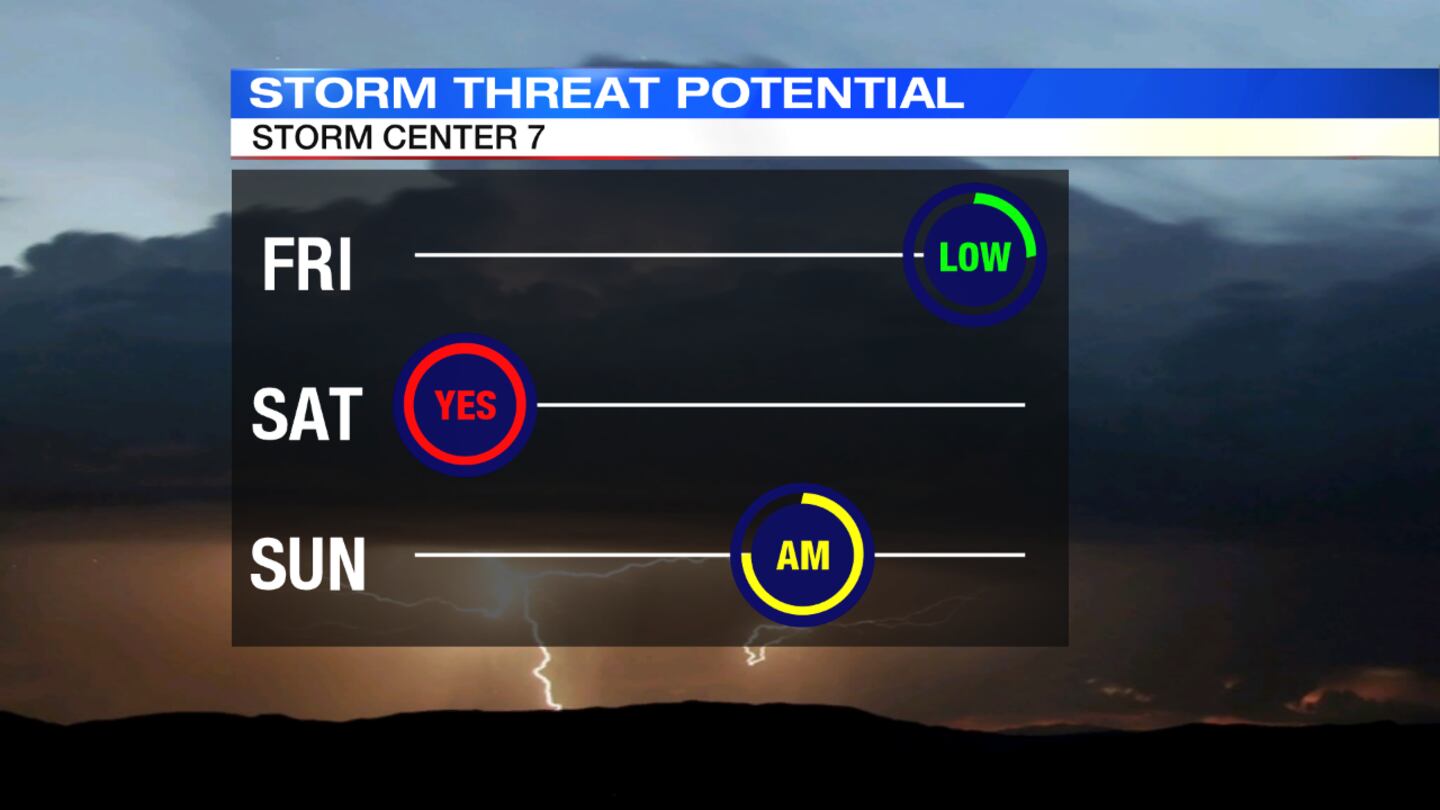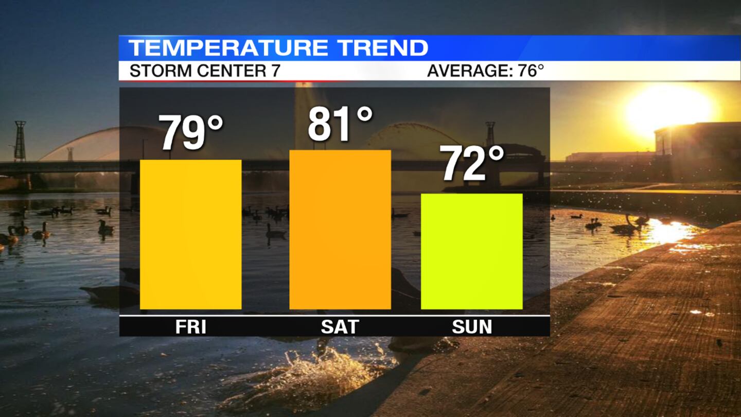 Saturday: The weekend starts dry with highs around 80 degrees. Clouds increase with the chance for passing showers or storms by the late afternoon and evening.