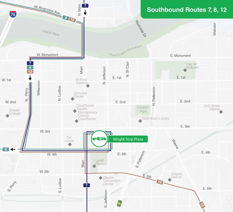 - Northbound Routes 8, 9, and 12 - From South Main Street, they will turn right into Wright Stop Plaza. When exiting Wright Stop Plaza, they will turn right onto Jefferson Street, left onto Fourth Street, left onto Patterson Boulevard, which turns into Riverside Drive, left onto Babbit Street, left onto Main Street, and then right onto Riverview Avenue back to the designated routes.