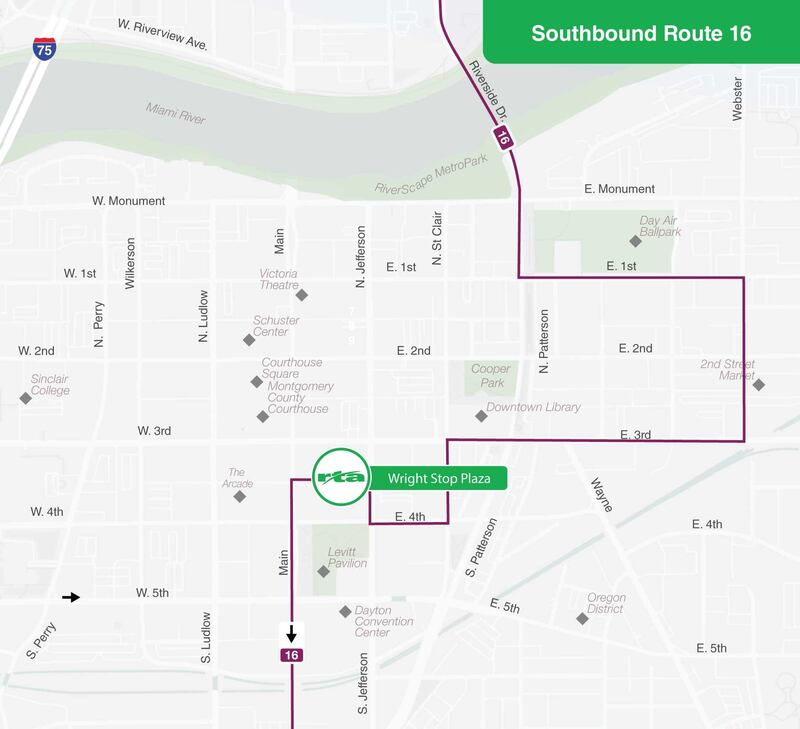 - Northbound Route 16 - From South Main Street, it will turn right into Wright Stop Plaza. When exiting, it will turn right onto Jefferson Street, left onto Fourth Street, and then left onto Patterson Boulevard, which turns into Riverside Drive, back to the designated route.