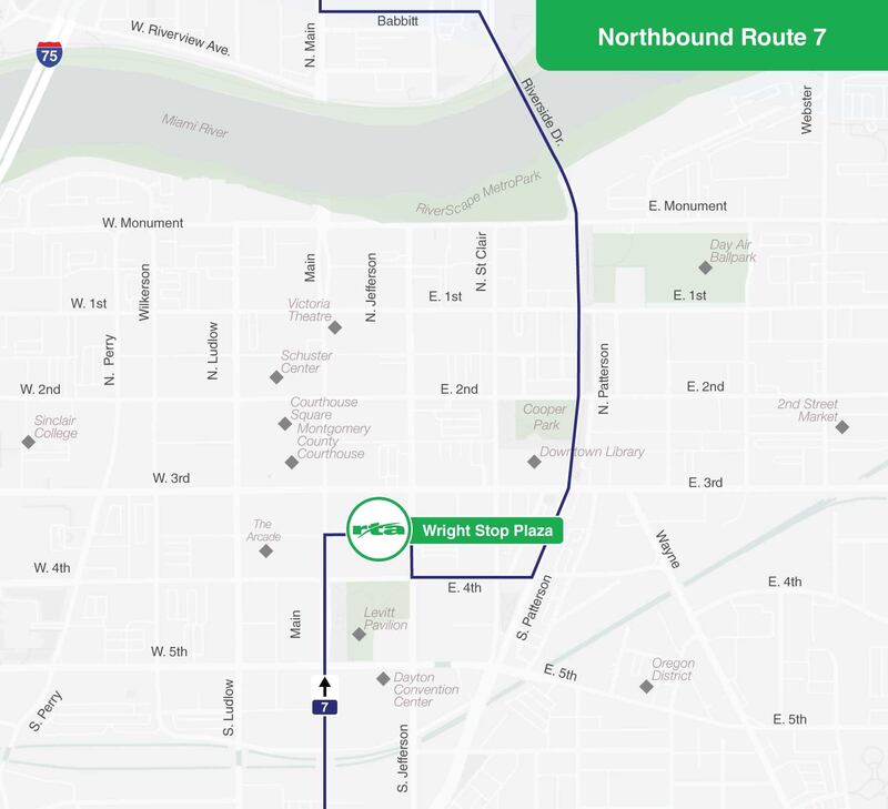 - Northbound Route 7 - From South Main Street, it will turn right into Wright Stop Plaza. When exiting, it will turn right onto Jefferson Street, left onto Fourth Street, left onto Patterson Boulevard, which turns into Riverside Drive, then left onto Babbit Street and right onto Main Street back to the designated route.