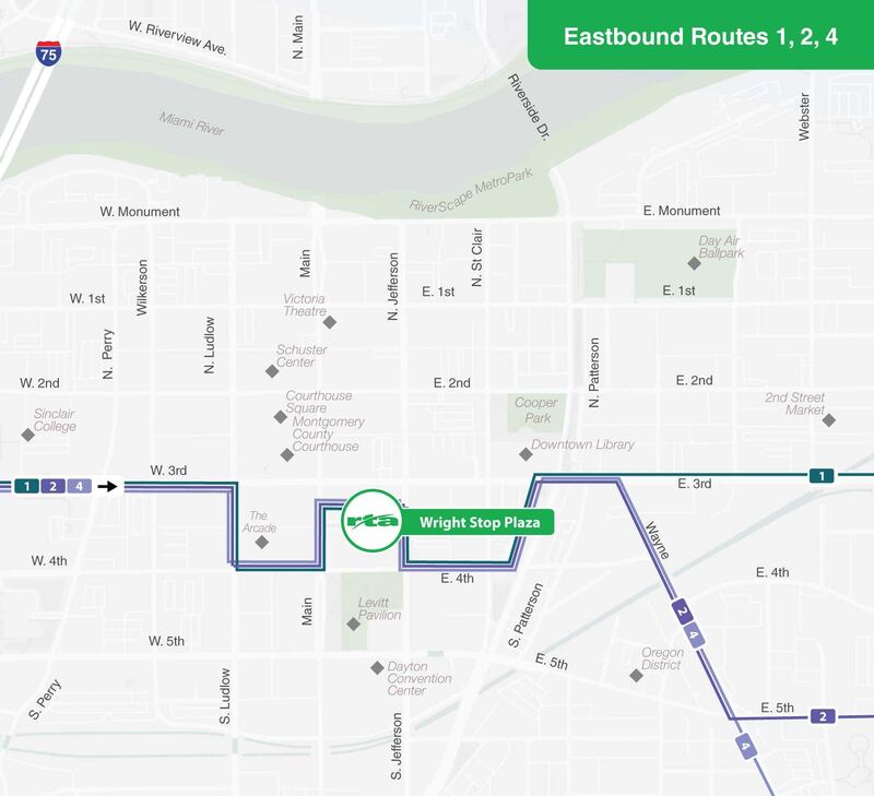- Westbound Routes 1, 2, and 4 - From East Third Street, they will turn left onto St. Clair Street, right onto Fourth Street, right onto Jefferson Street, and enter Wright Stop Plaza. When exiting, they will turn left onto Main Street back to the designated routes.