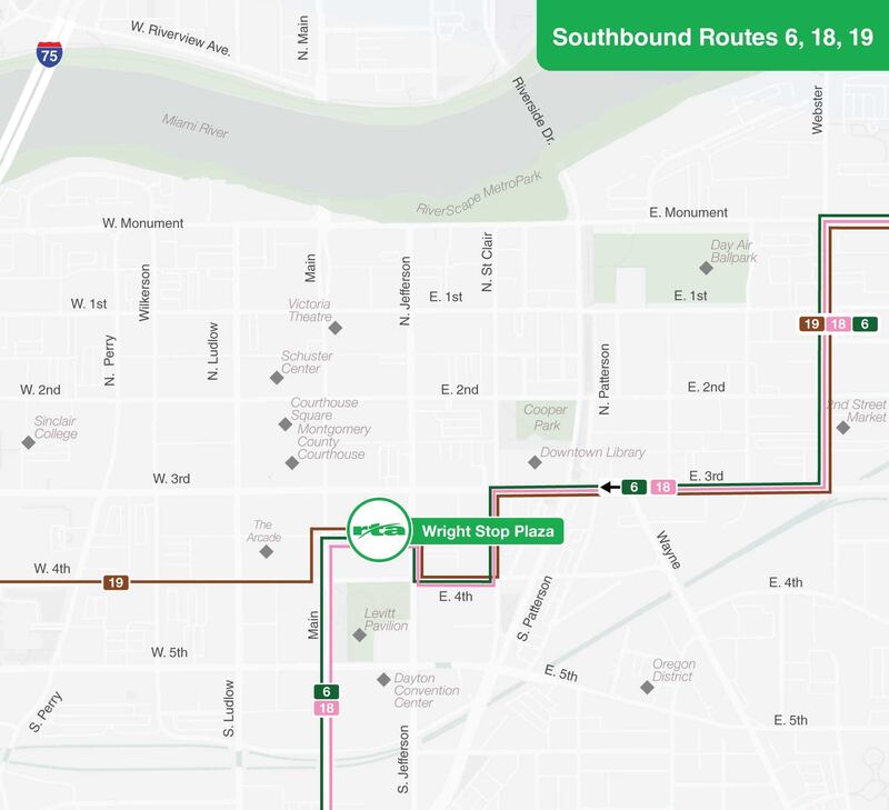 - Northbound Routes 6, 17,18, 19, and 22 - From South Main Street, they will turn right into Wright Stop Plaza. When exiting, they will turn right onto Jefferson Street, left onto Fourth Street, left onto Patterson Boulevard, and then right onto First Street back to the designated routes.