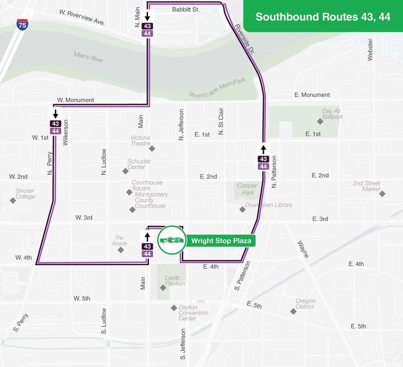 - Northbound Routes 43 and 44 - From Wright Stop Plaza, they will turn right onto Jefferson Street, left onto Fourth Street, left onto Patterson Boulevard, which turns into Riverside Drive, left onto Babbit Street, and then right onto Main Street back to the designated routes.