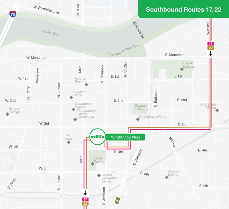 - Southbound Routes 17 and 22 - From Webster Street, they will turn right onto Third Street, left onto St. Clair Street, right onto Fourth Street, right onto Jefferson Street, and enter Wright Stop Plaza. When exiting, they will turn left onto Main Street back to the designated routes.