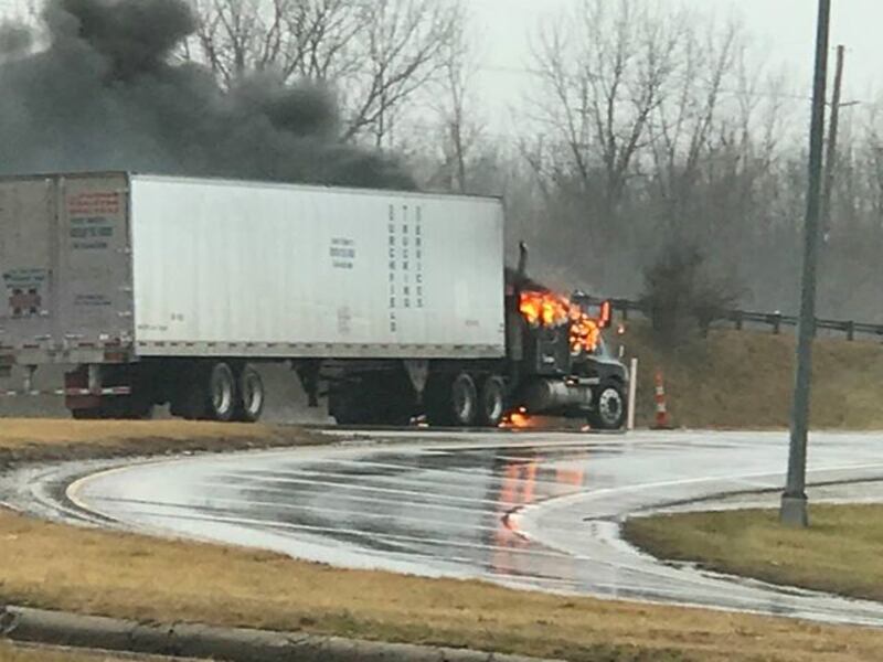 The Ohio 72 ramp to westbound I-70 in Springfield Twp. is blocked after a fire broke out in the cab of a semi Friday morning.