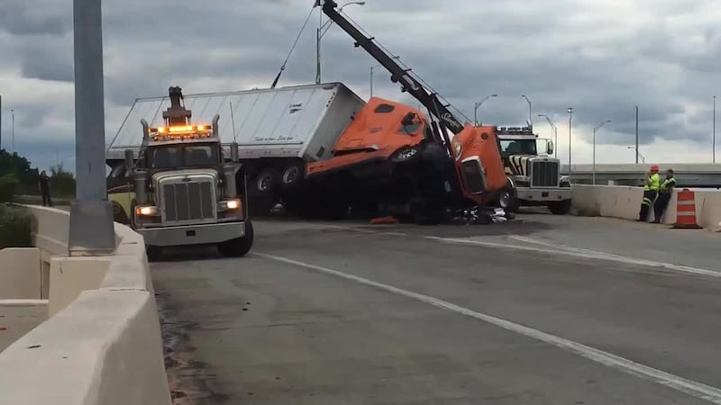 The semi-trailer is upright and in the process of being towed. The ramp from U.S. 35 west to I-75 north is expected to be opened shortly.
