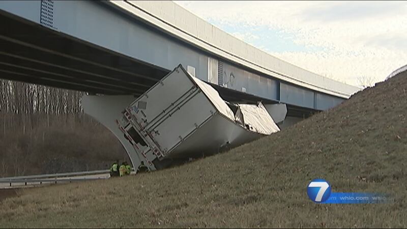 According to the preliminary investigation, the semitrailer failed to slow for the curved exit ramp and the rig rolled over the cement wall and came to a rest under the ramp from I-75 North to I-70 West.