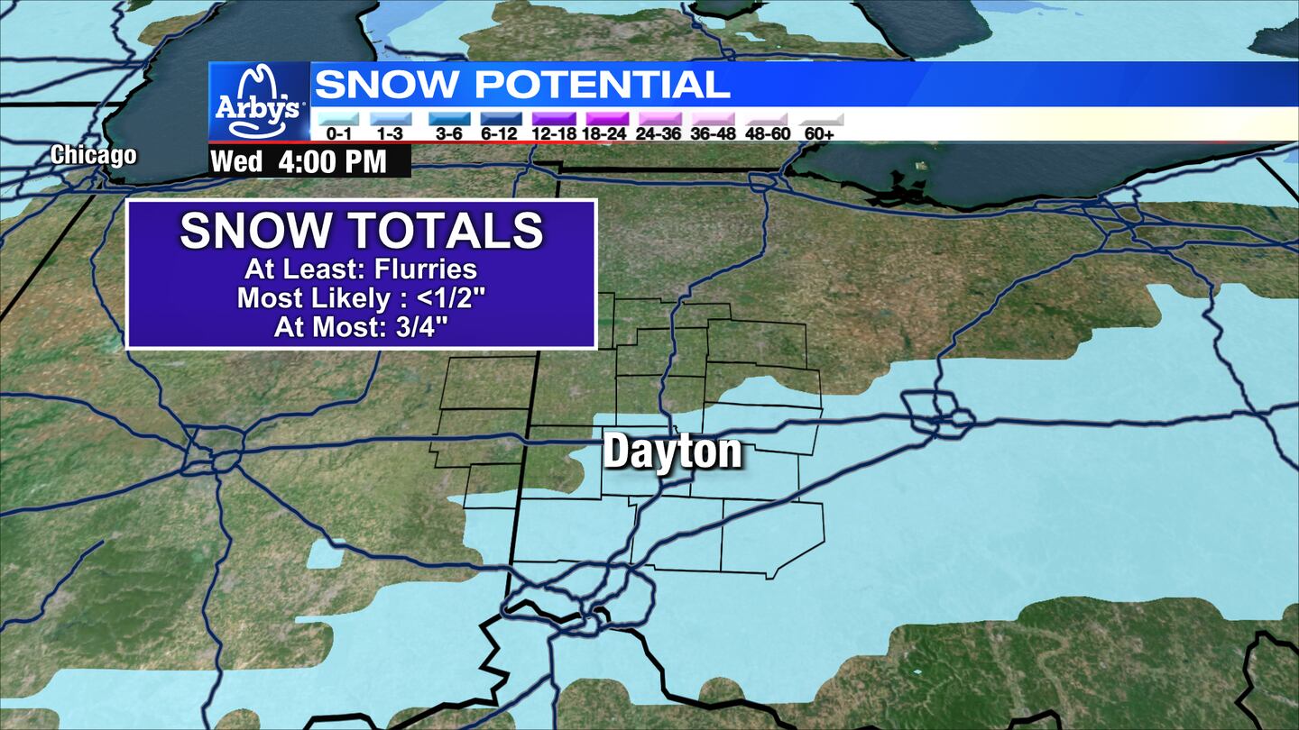 WEDNESDAY: Any overnight snow flurries quickly taper off Wednesday morning. Dry, mostly cloudy, and cold conditions follow for the rest of the day. High temperatures reach the upper 30s. More clearing into Wednesday night and cold. Lows in the middle 20s.