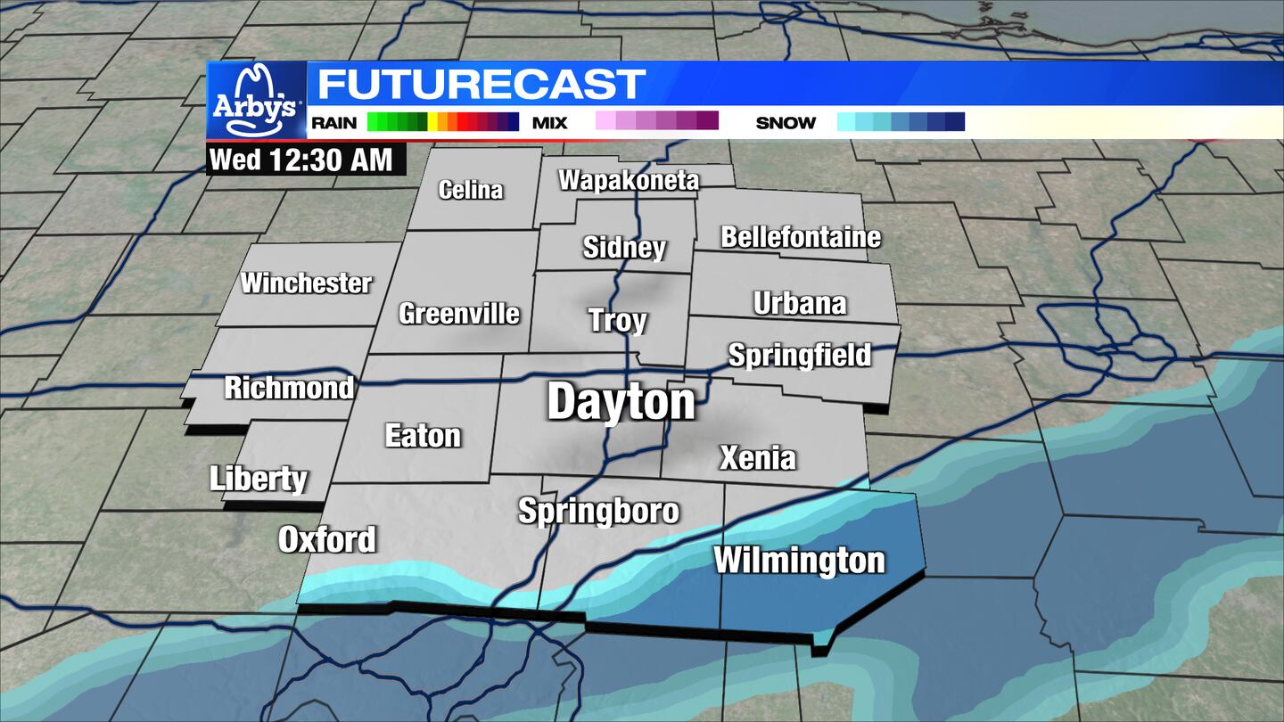 TODAY: A weak weather disturbance brings a chance for a few light snow showers or snow flurries this evening and overnight, mainly south of Dayton.