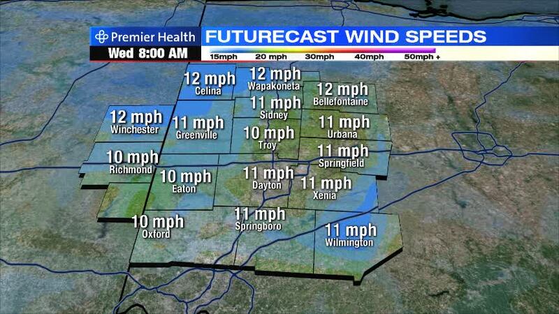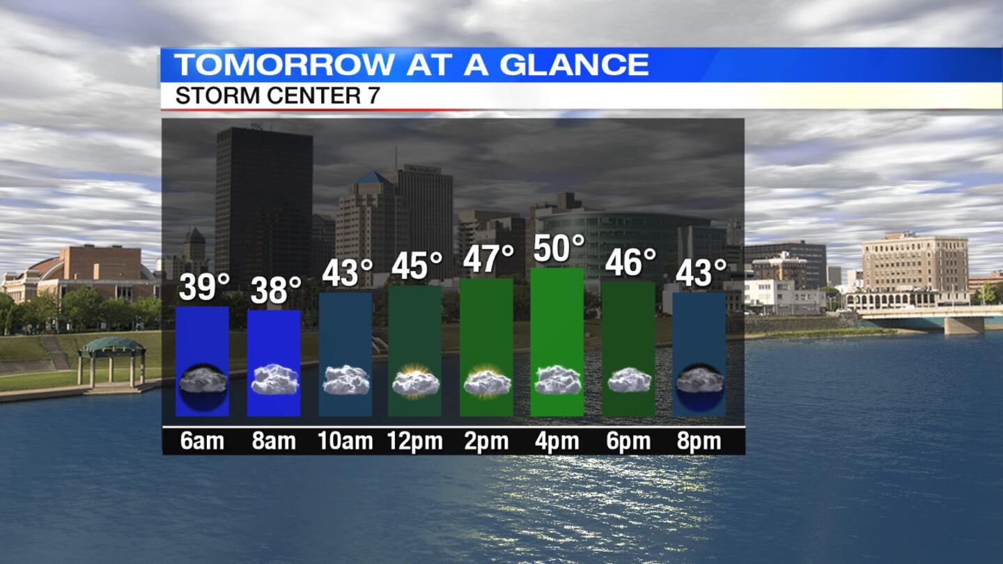 Clouds will remain with breezy, chilly conditions, Storm Center 7 Chief Meteorologist Eric Elwell said. A few light showers or sprinkles are possible. Temperatures will drop into the upper 30s by morning.