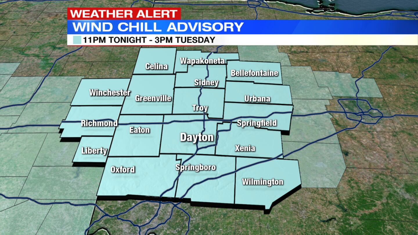 A Wind Chill Advisory is now in effect until 3 p.m. Tuesday as wind chill values dip to 10 below to 15 below zero.