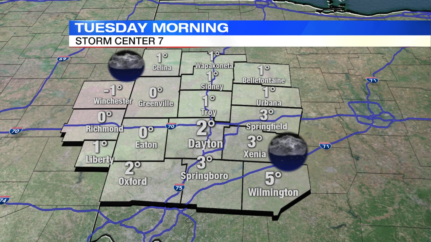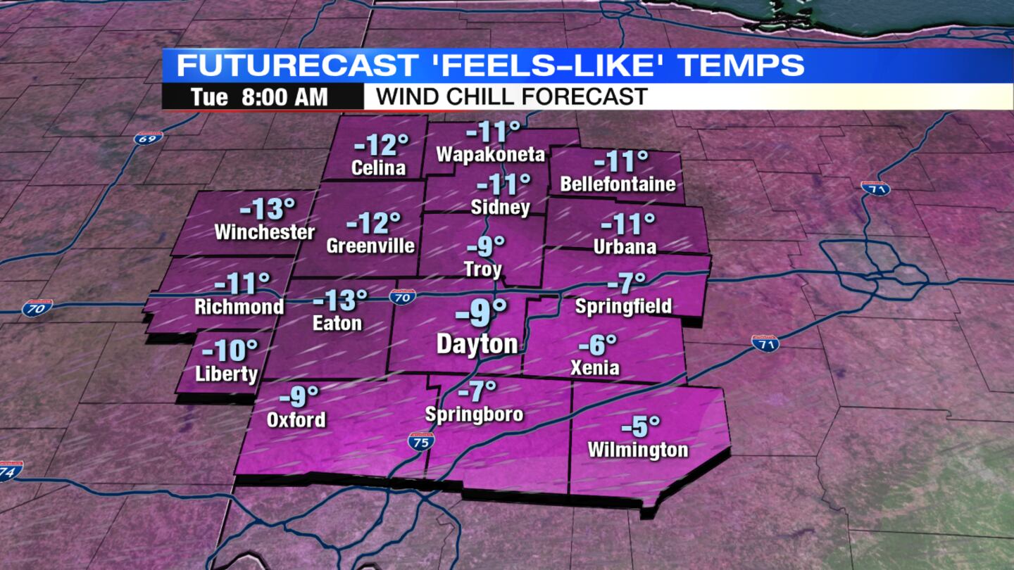 TUESDAY: A wind chill advisory that began Monday night remains in effect through 3 p.m. Skies will be partly to mostly cloudy. Temperatures will hold to around 10 degrees with wind chill readings staying anywhere from 5 below to 15 below zero as wind gusts continue. Some flurries will be possible toward evening.