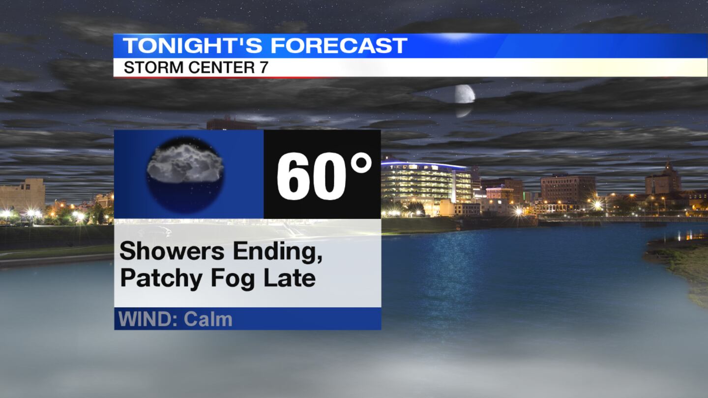 TONIGHT: Any leftover showers should taper off with some breaks in the clouds. Patchy fog will be possible after midnight and into the early morning Wednesday. Lows will be in the lower 60s.