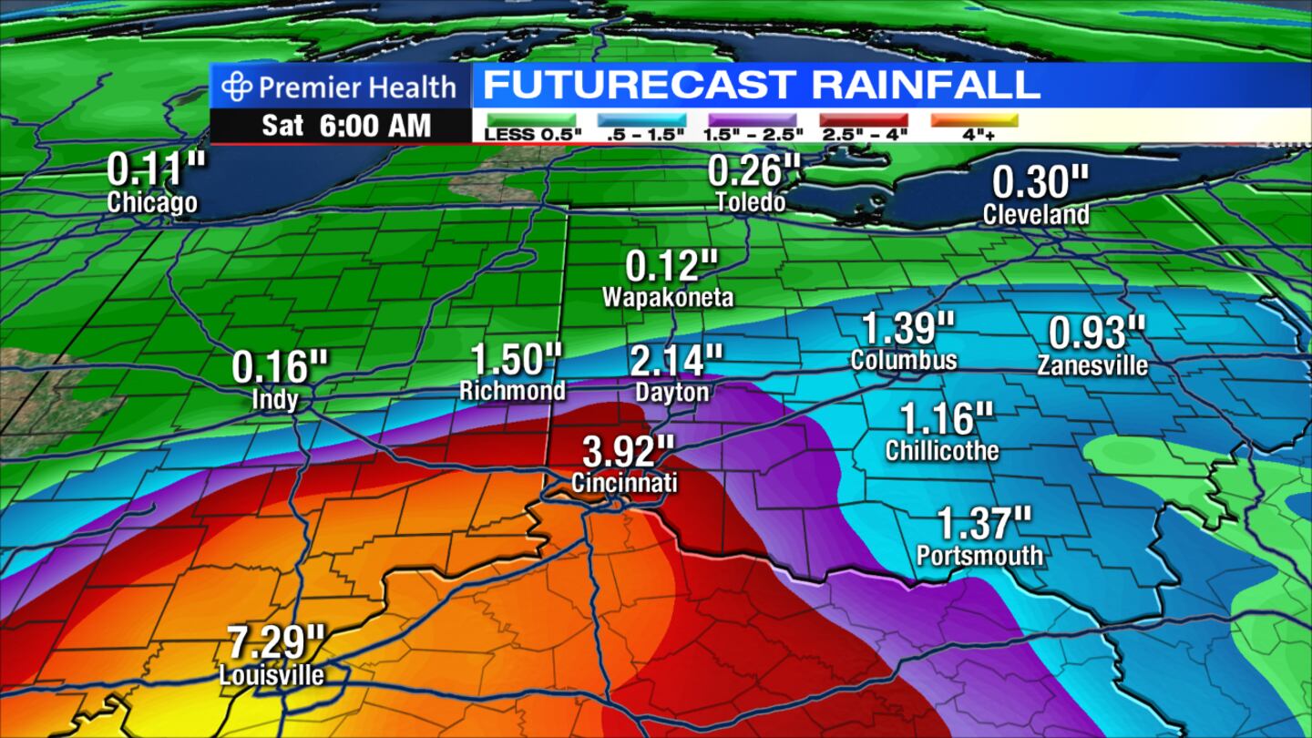 SATURDAY: Numerous showers and a few embedded thunderstorms will be likely, especially early in the day. Highs will be held in the lower to middle 70s.