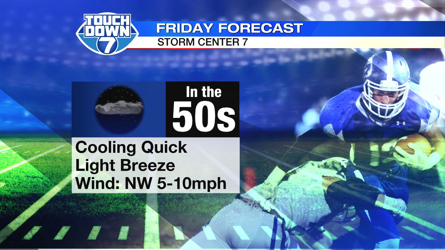 Partly cloudy skies continue into the evening for Friday football. Temperatures will drop through the 50s during the games.