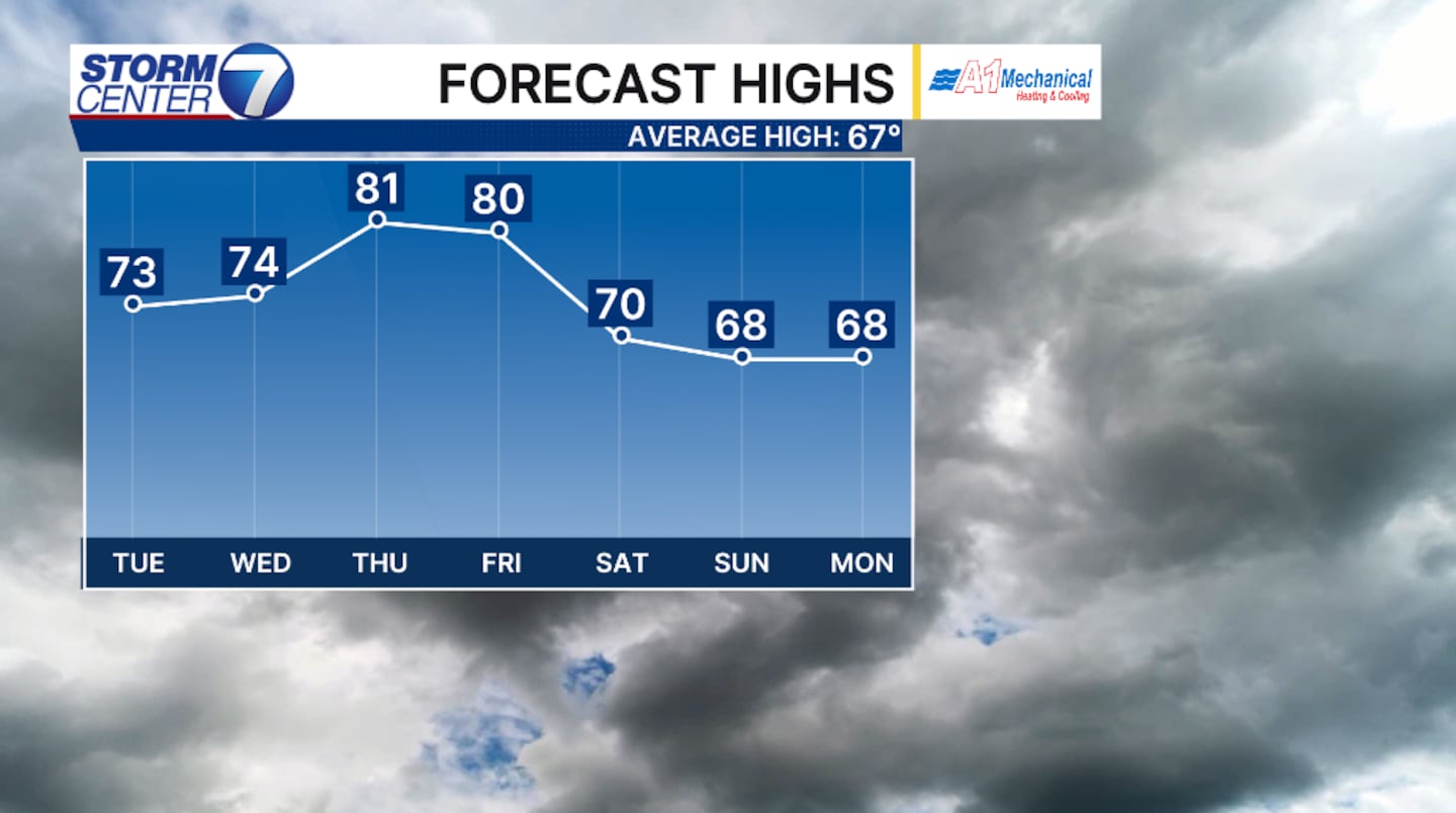 An area of high pressure will slide east and this will change the wind direction going into Tuesday and Wednesday. High temperatures will push into the middle 70s both days. However, even warmer weather returns.