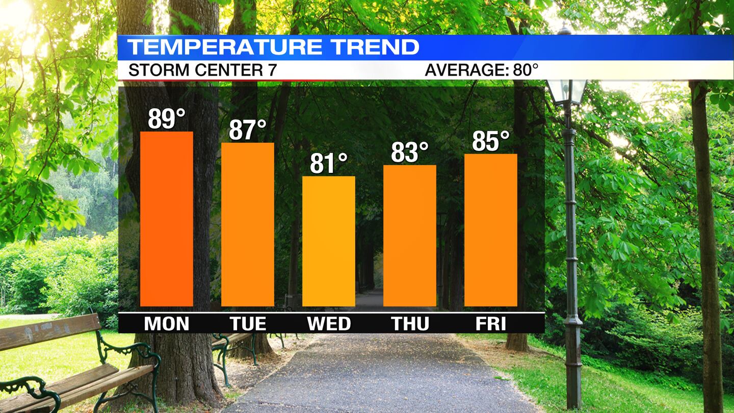 FRIDAY: Partly cloudy skies, trending dry but staying warm with highs in the mid 80s.