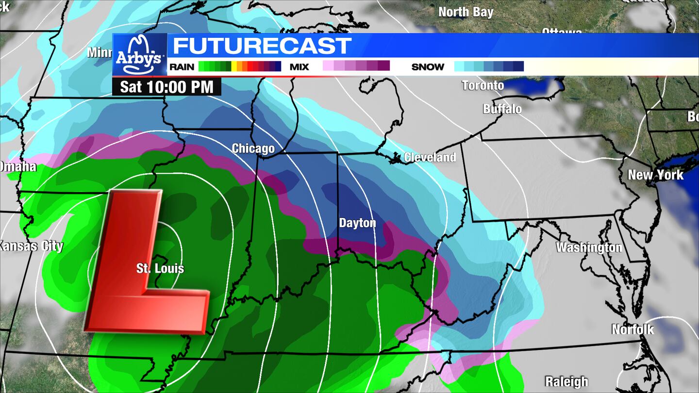 SATURDAY: Clouds increase on Saturday with highs in the middle 30s. Snow showers arrive from the southwest into the evening and may mix with rain in spots by Sunday morning. . Accumulating snow is likely.