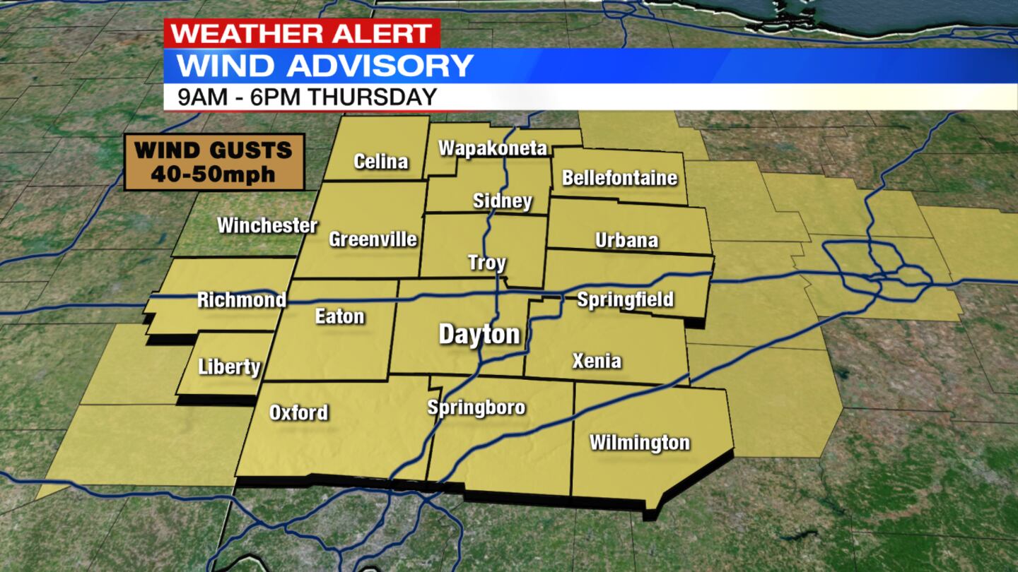 A wind advisory goes into effect from 9 a.m. to 6 p.m. Thursday for the entire Miami Valley with wind gusts up to 50 mph possible. The following counties are affected: Auglaize, Butler, Champaign, Clark, Darke, Greene, Logan, Mercer, Miami, Montgomery, Preble, Shelby, Warren and Wayne (Indiana).