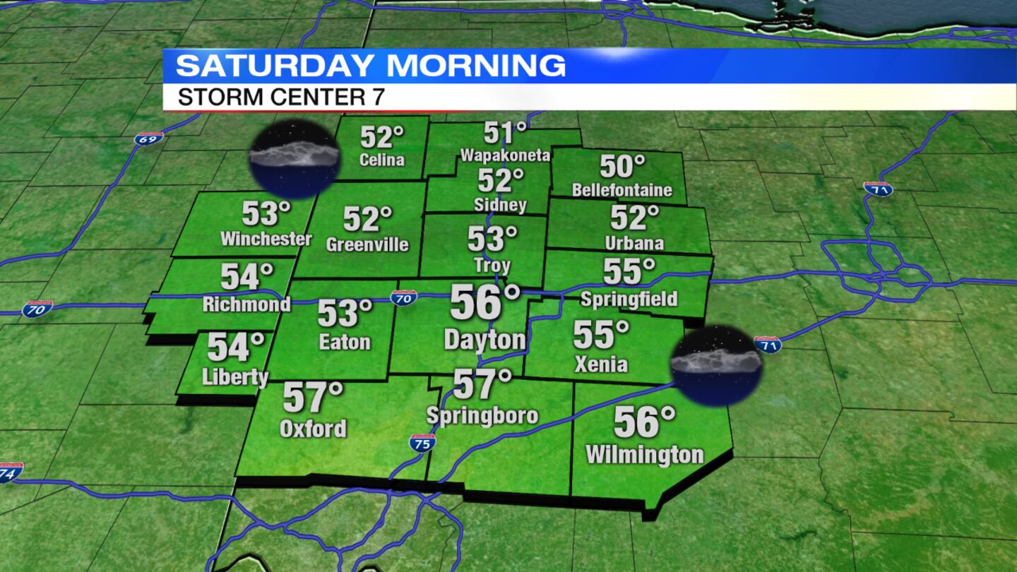 Saturday: Clouds roll back in and stick around for the majority of the day on this first day of autumn. Much cooler with high temperatures only climbing into the mid to upper 60s. A few light showers could wave through towards the far south near Cincinnati.