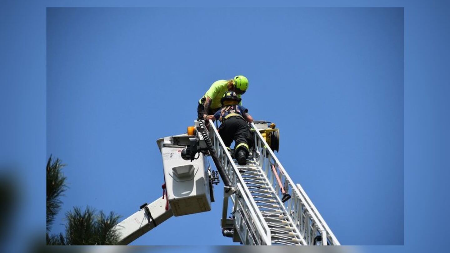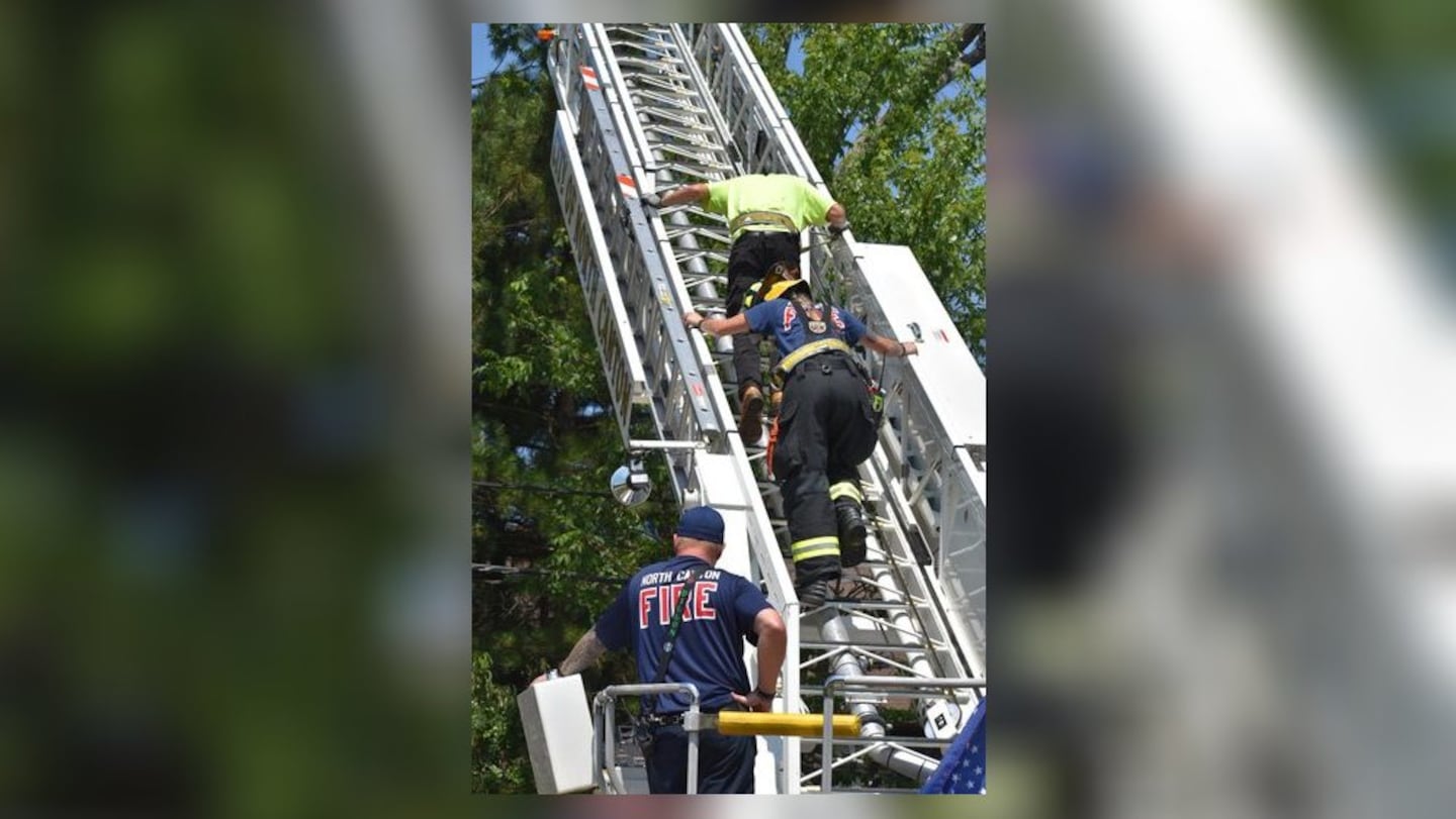 A firefighter went up a fire truck ladder to assist the worker to the ground, according to the North Canton Fire Department.