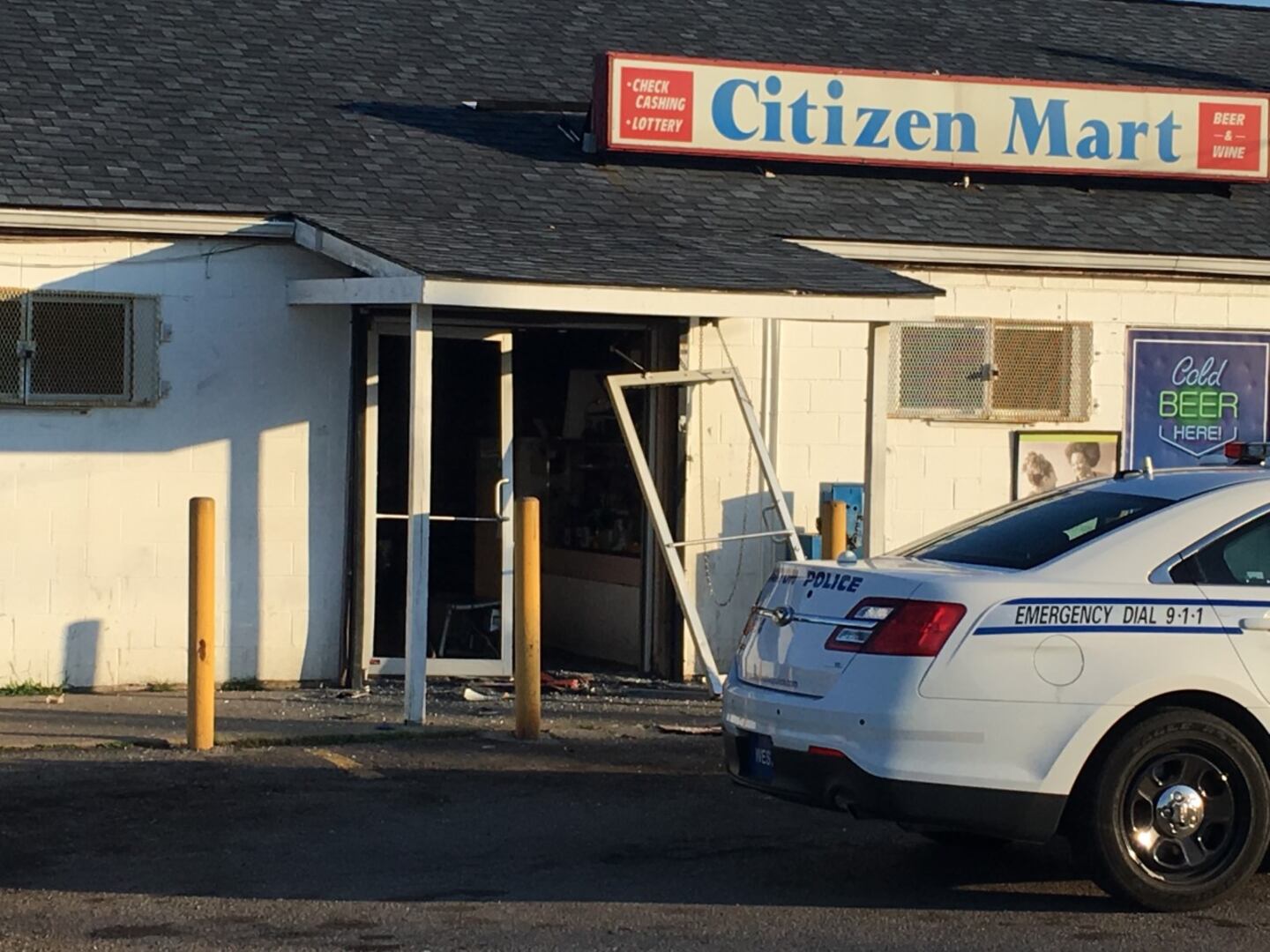 One of the store’s double doors was ripped off the hinges and the other had the glass broken out.