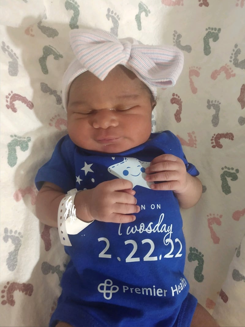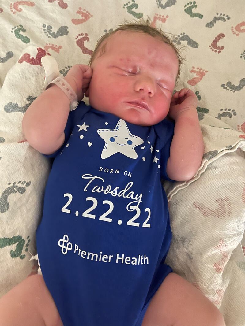 Premier Health shared photos of some of the babies born on Tuesday, showcasing the commemorative blue onesies which say “Born on Twosday.”