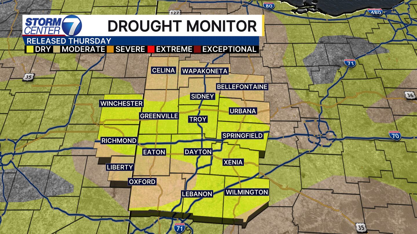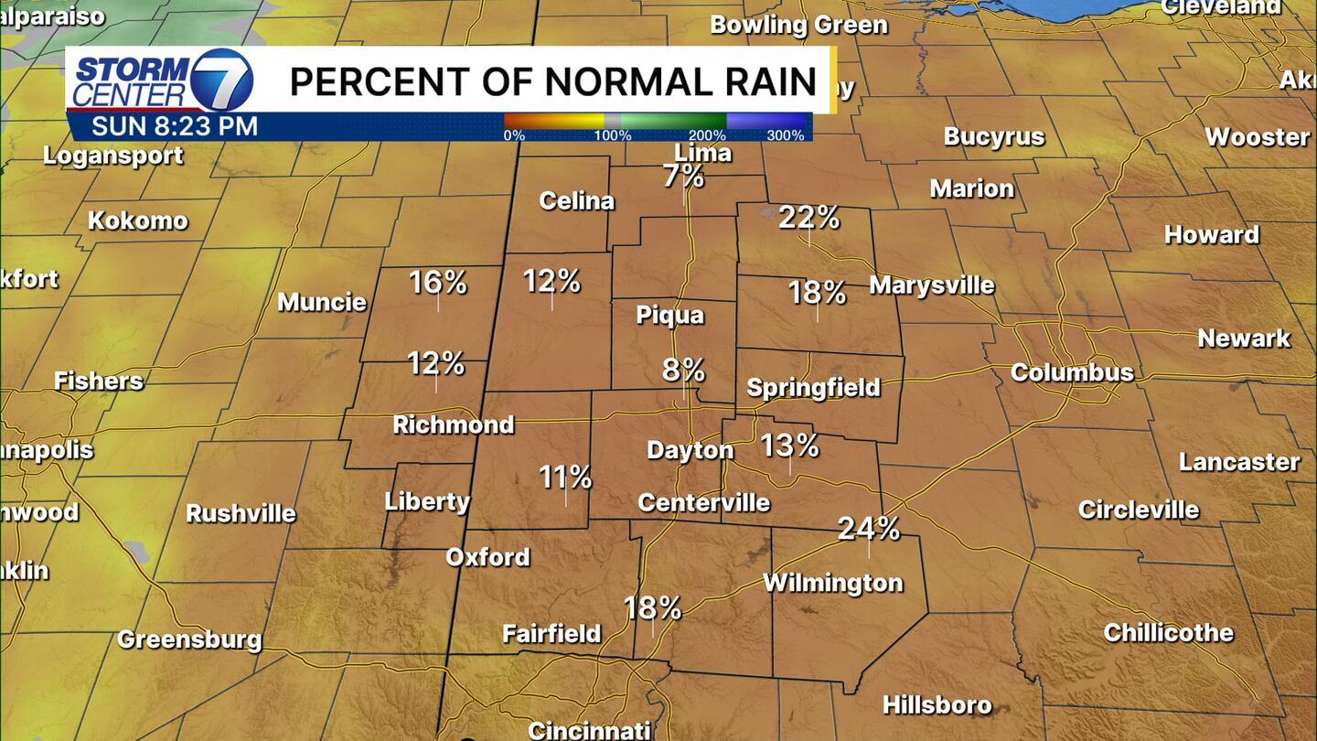 This graphic really puts things into perspective for us! To see the entire region between 5 and 25 percent of normal rainfall in the last 30 days really tells us we are dry. I have concerns the next drought monitor update will show worsening conditions for the entire Miami Valley.