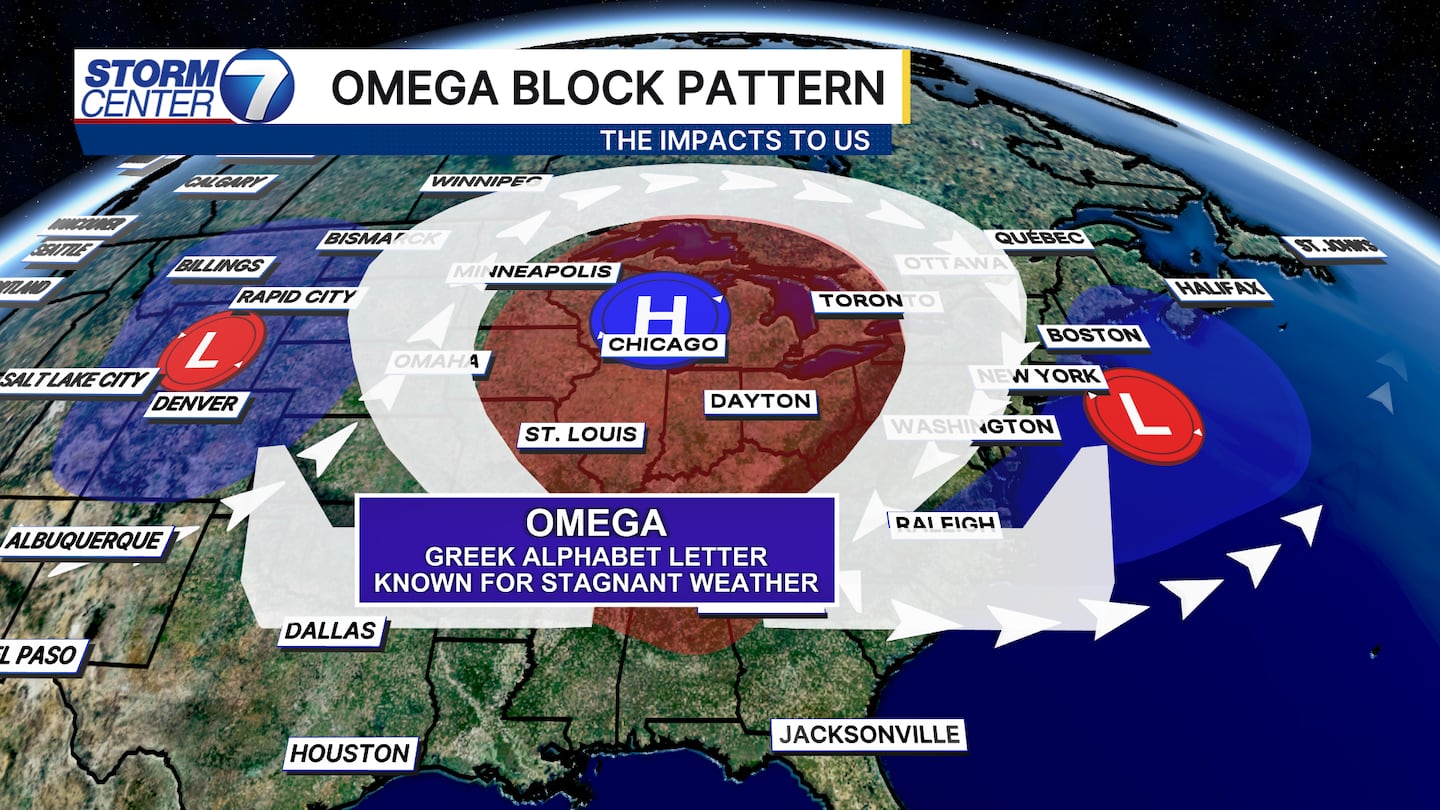 DAYTON — Good Sunday evening, everyone! Weather Specialist Nick Dunn here on this Sunday to take a look at the forecast! In case you missed my weather segment at 6:00 PM, we have an Omega Block setting up this week. This means the overall pattern for us will give us warm and dry conditions as we are in the center of the block (or ridge).