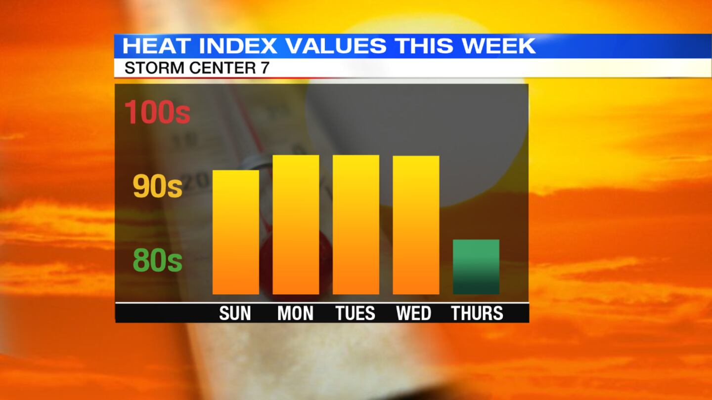 Sunday: There will be partly sunny skies with hot and breezy conditions as highs reach the low 90s (Heat Index of 96). There is also a chance for thunderstorms in the afternoon hours.