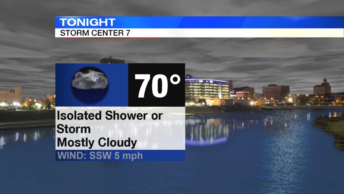 This evening: Expect mostly cloudy skies this evening with a chance to see showers and thunderstorms, according to Storm Center 7 Meteorologist Molly Coates. A few storms may be on the strong to severe side with damaging winds, heavy downpours and lightning. Temperatures will fall through the 80s.