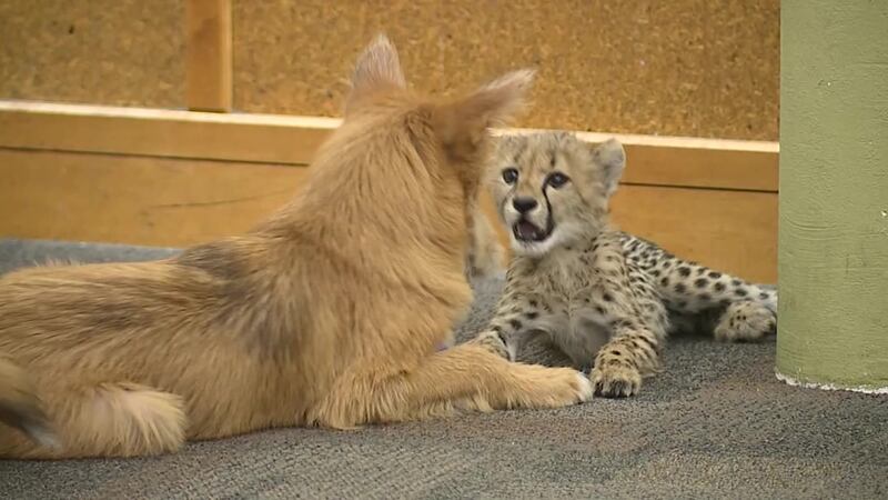 A cheetah cub, Kris, has been spending time bonding with a rescue puppy, named Remus. And on Thursday, zookeepers captured an adorable moment as the two played together.