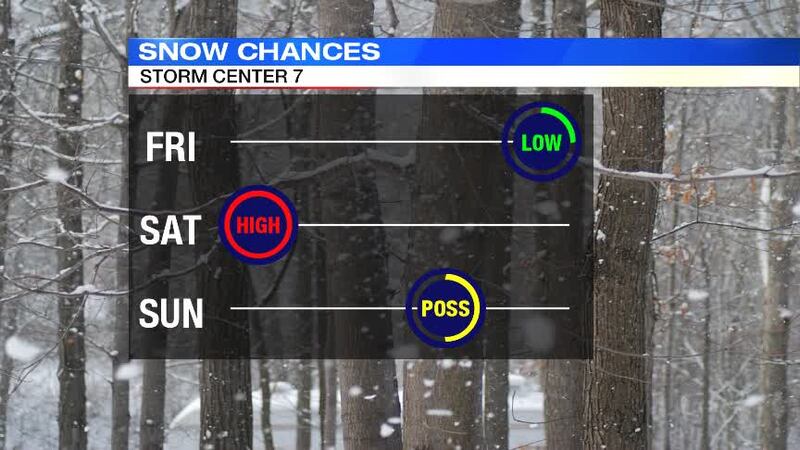 SATURDAY: Scattered snow showers likely throughout the day. A light accumulation expected, especially south. Highs expected in the lower 30s.