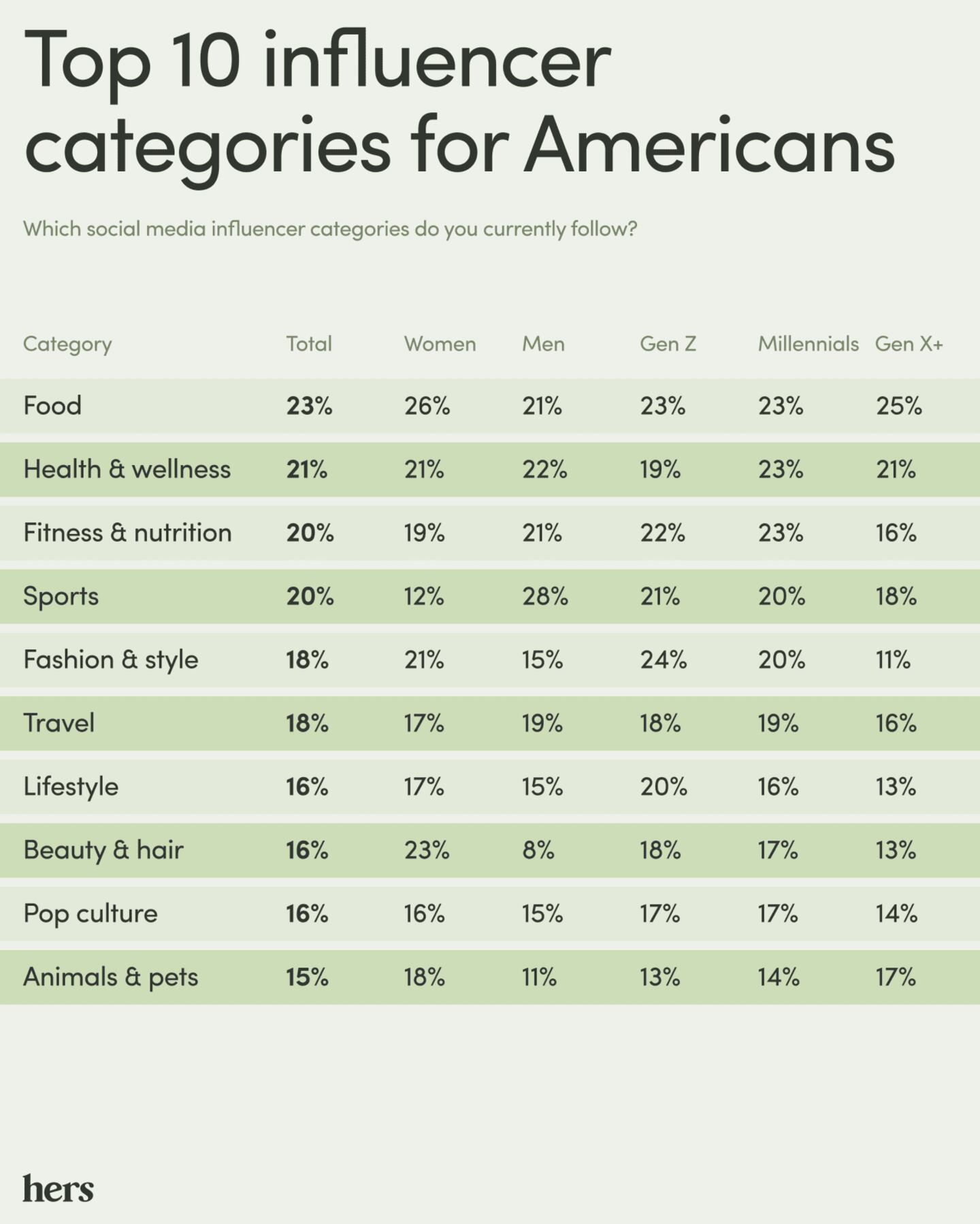 Earlier this year, Hers conducted an online survey, and its 7,100 respondents provided their input on the impact of influencers from the numerous categories on their lives.