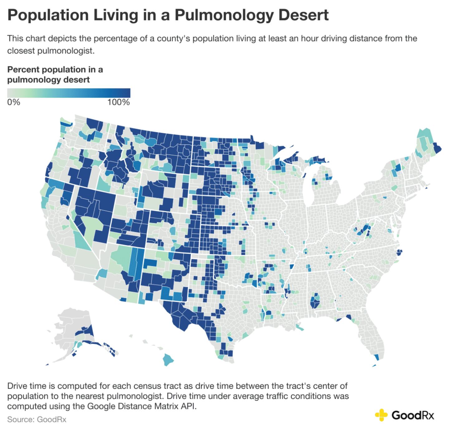 GoodRx then identified counties where a majority of the population lived at least an hour from the closest pulmonologist.