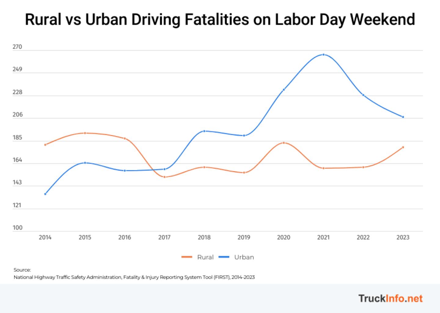 Over the decades, urban driving fatalities were nearly twice as high from 2013 to 2022, but from 2014 to 2023, the increase eased to about 1.5 times. In contrast, rural fatalities saw a much sharper decline over the same period.