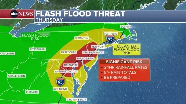 (NEW YORK) -- The Interstate 95 corridor from New York City to Washington, D.C., is bracing for dangerous flooding on Thursday.