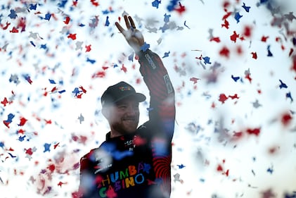 NASCAR Cup Series DuraMax Grand Prix Powered by RelaDyne AUSTIN, TEXAS - MARCH 01: Tyler Reddick, driver of the #45 Chumba Casino Toyota, celebrates` after winning his third race in a row to start the 2026 NASCAR season winning the NASCAR Cup Series DuraMax Grand Prix Powered by RelaDyne at Circuit of The Americas on March 01, 2026 in Austin, Texas. (Photo by James Gilbert/Getty Images) (James Gilbert/Getty Images)