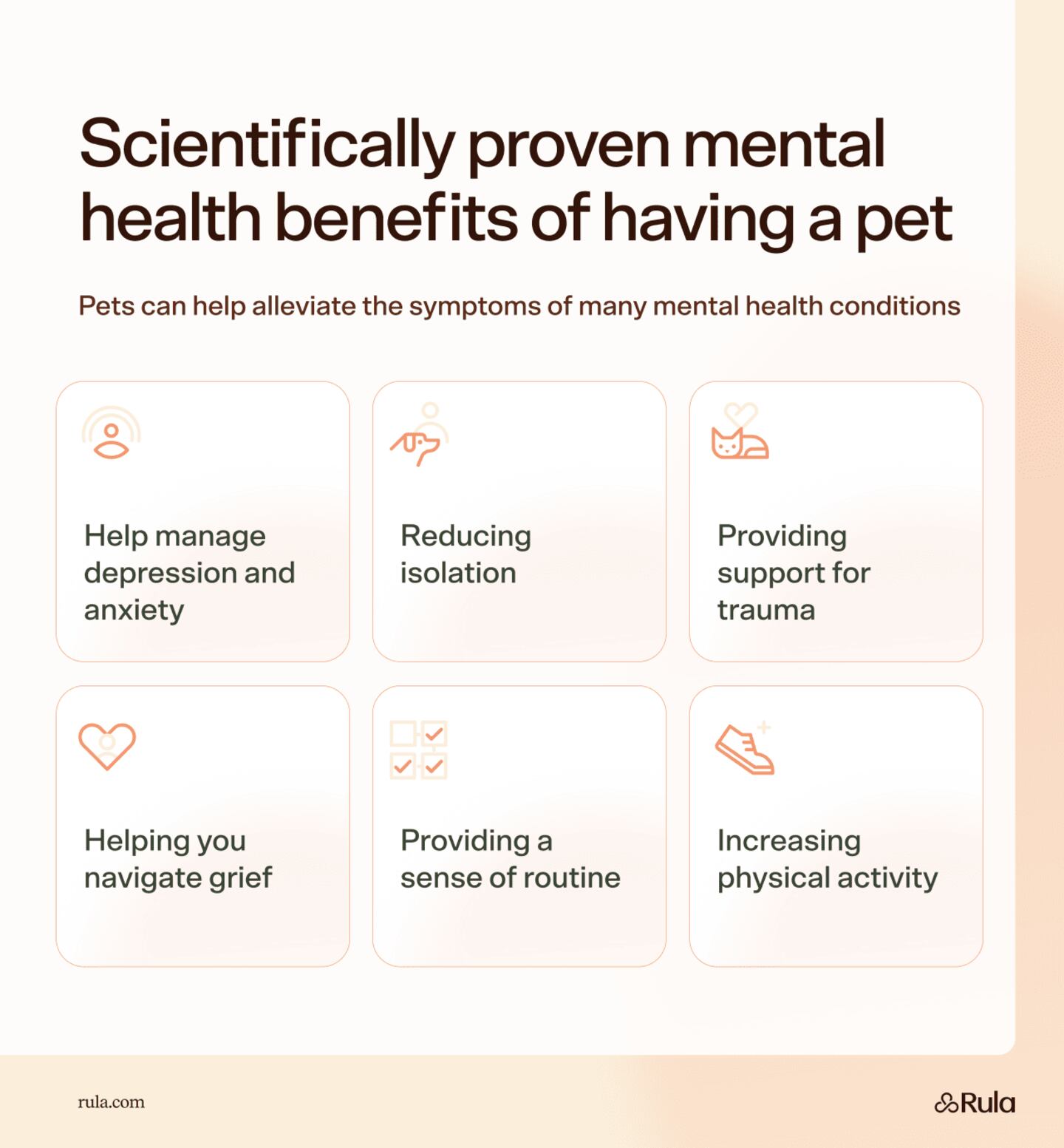 - Research shows many mental health benefits to having a pet. Pet ownership has been proven to help people living with conditions like depression, anxiety, PTSD, ADHD, autism, and more.