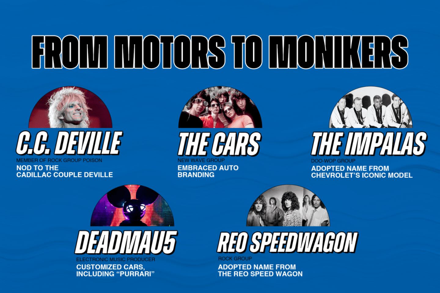 Automotive influence in music extends beyond lyrics. Throughout music history, artists and bands have drawn inspiration from the automotive world for their stage names. From 1950s vocal groups like the Cadillacs and the El Dorados, to the Cadillac Tramps (1990s Orange County rockabilly punkers) and hair-metal guitarist C.C. DeVille, GM’s luxury division has inspired more than a few band and artist names. Other GM badges have had similar influence, christening groups such as the Chevelles (Australia) and Chevelle (American), 1960s girl group the GTOs, and 1950s doo-wop group the Impalas.