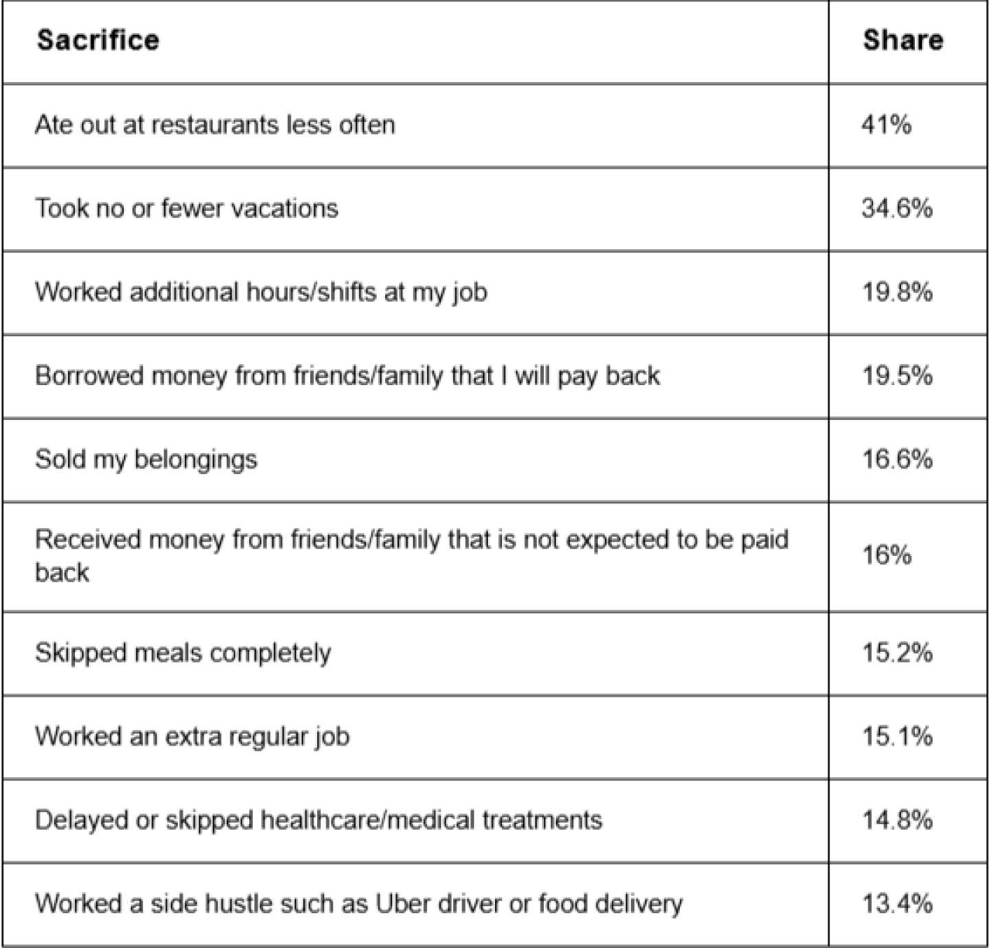 Let’s take a look at the most common things people are giving up to keep up with housing costs. Then we’ll analyze some of the less common but more significant tradeoffs.