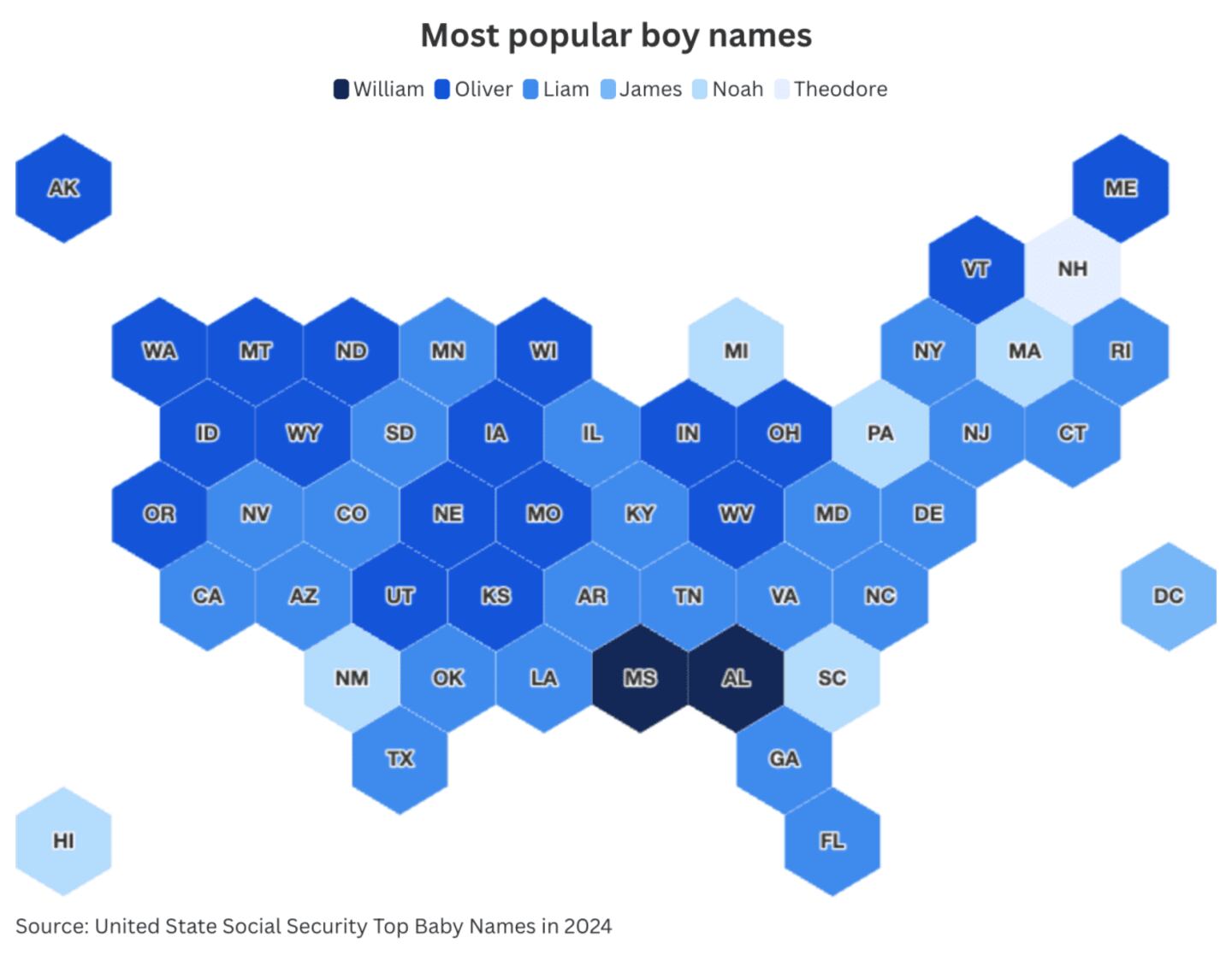 Across the United States, 2024 saw patterns in how baby boys were named. These trends will likely continue in some capacity into 2025. Four of the top five names ranked as #1 in various states. Interestingly, William, which was ranked in the #10 spot, was the most popular name for Missouri and Alabama.