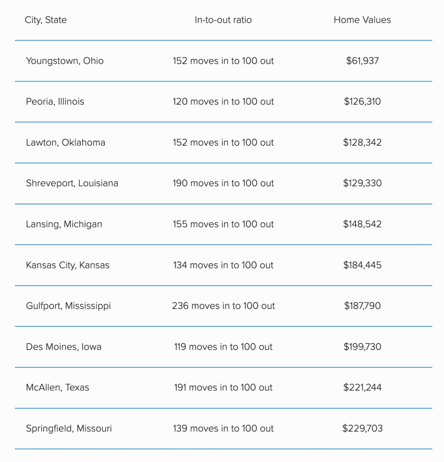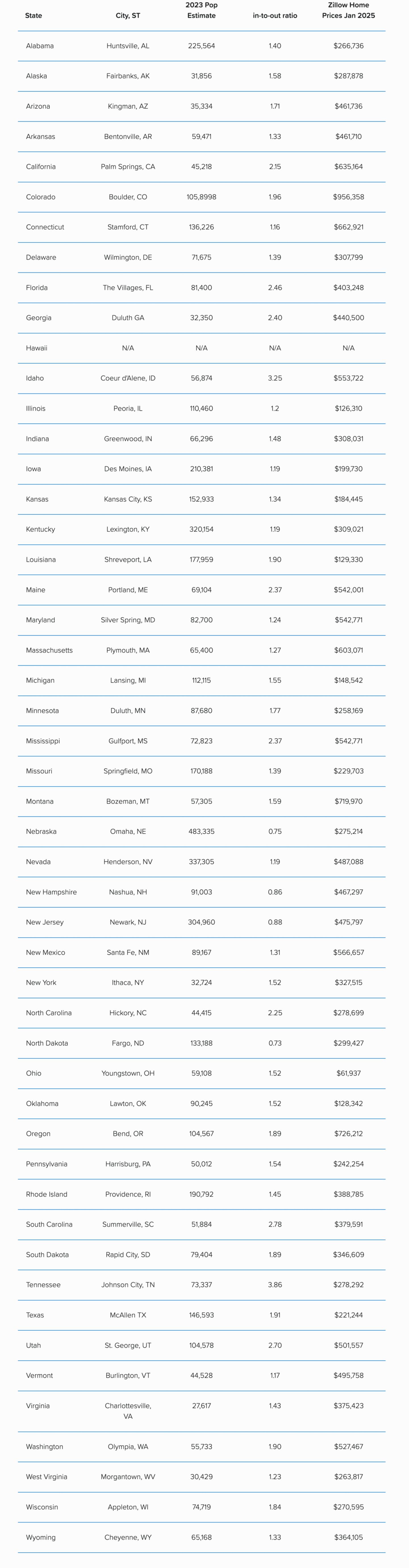 There were four states that didn't have a single city in the dataset with an in-to-out ratio greater than "1" meaning there was not technically a top "move to" city according to mover search data. These cities, instead, were the least "moved out" of cities in their state: