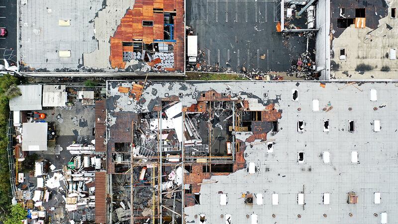 The storm pulled off a 5,000-square-foot portion of the roof, shattered the building’s skylights, broke a gas line and damaged fire sprinklers, according to the AP. Turner said the damage could close his polyester fiber business, Turner Fiberfill, for months, the AP reported.