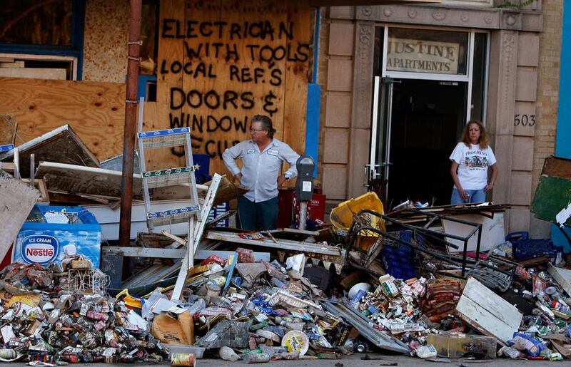 Residents of the Justine Apartments stand near a pile of rotting food outside their front door in Galveston, Texas. The food was removed from a grocery store in the building after it was flooded by Hurricane Ike. (Scott Olson/Getty Images)